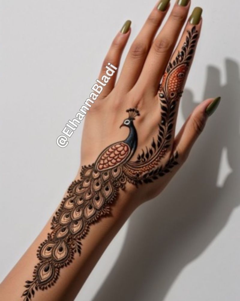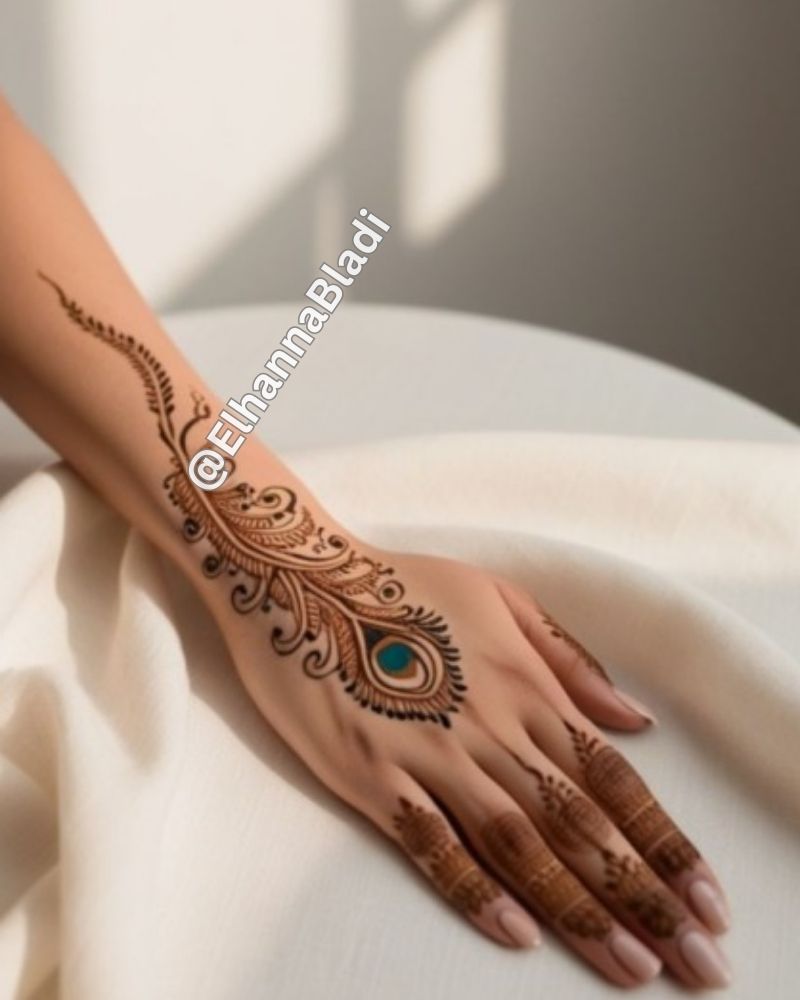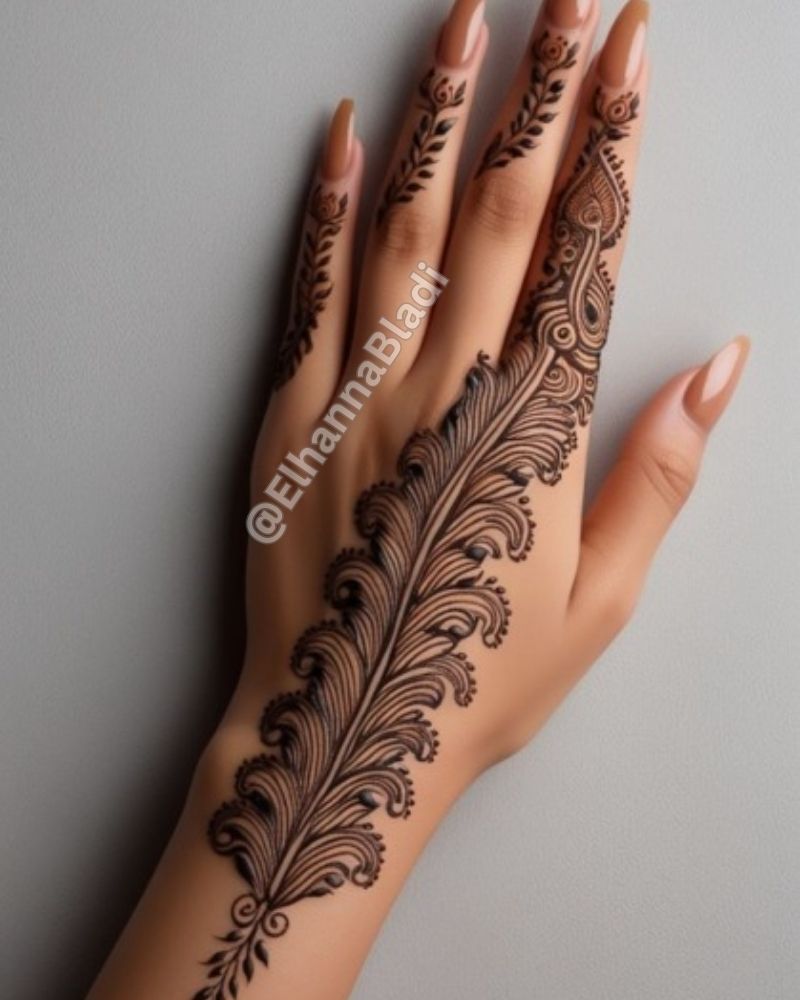 اكبر كولكشن نقش حناء لليدين فخمة 2025 :نقش حناء 2025 في هذه الصورة يعكس البساطة الممزوجة بالأناقة من خلال تصميم طاووس رقيق يمتد بشكل عمودي على ظهر اليد. الطاووس يظهر بتفاصيل انسيابية وأنيقة، حيث يتميز بريش ناعم مزين بأشكال نباتية دقيقة تضيف لمسة من الجمال الطبيعي للنقش. هذا التصميم يركز على إبراز الأناقة بأسلوب بسيط وغير معقد، حيث يمتد النقش من المعصم حتى منتصف الإصبع، مع إضافة زخارف نباتية صغيرة على الأصابع لخلق تناسق مميز. النقش مثالي للمناسبات اليومية أو الاحتفالات البسيطة، حيث يجمع بين الجاذبية والعملية.