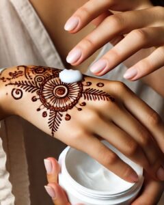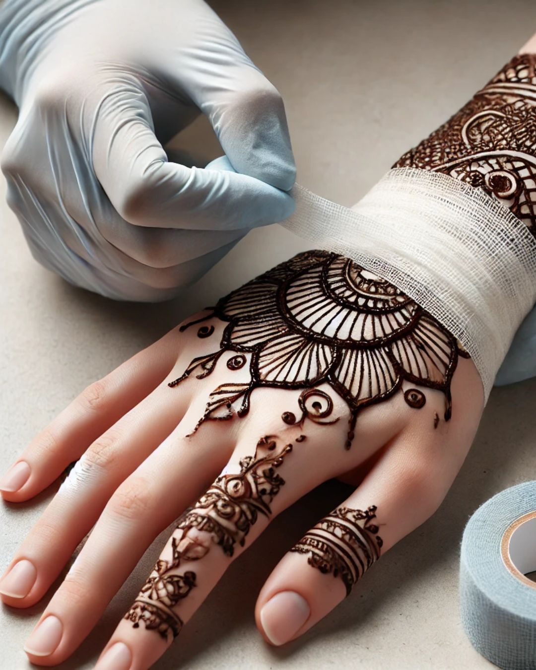 لف الحناء بشريط شاش طبي للحفاظ على اللون، مع التأكيد على الاستعانة بمختص لتجنب تلف النقش.