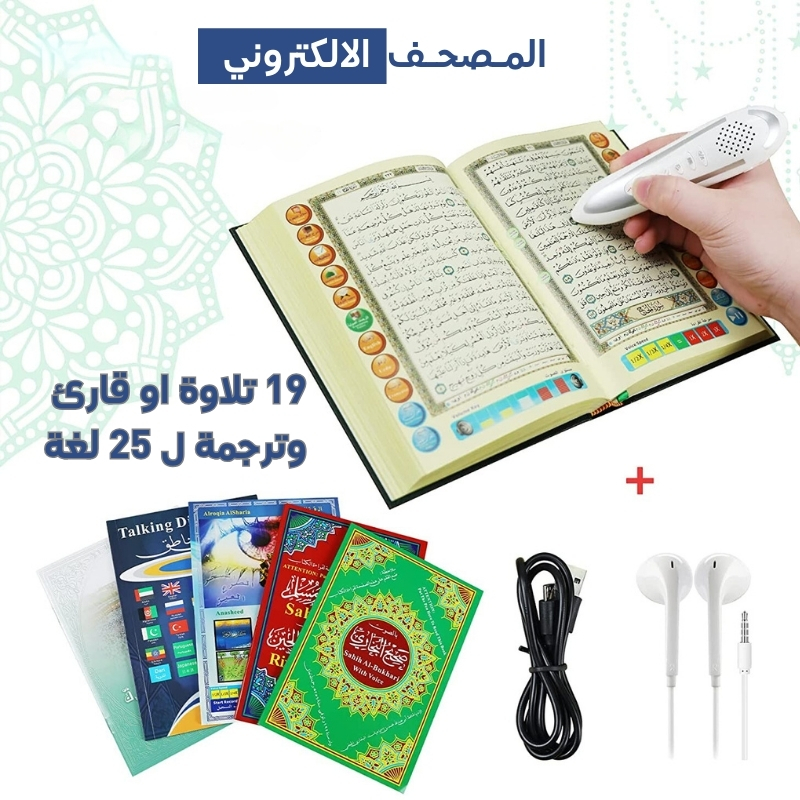 🎁 محتوى العبوة: قلم ناطق، المصحف الشريف، سماعات، شاحن، وكتيبات تعليمية.
